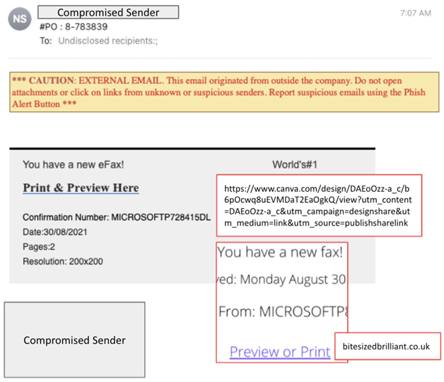 Third party risk management needs greater insight into email threats that originate from compromised third parties, or impersonate the same. In the below example, we have an email originating from a legitimate third party account, which has been compromised, and is now being used to send credential phishing emails, which are masquerading as a PO and eFax: