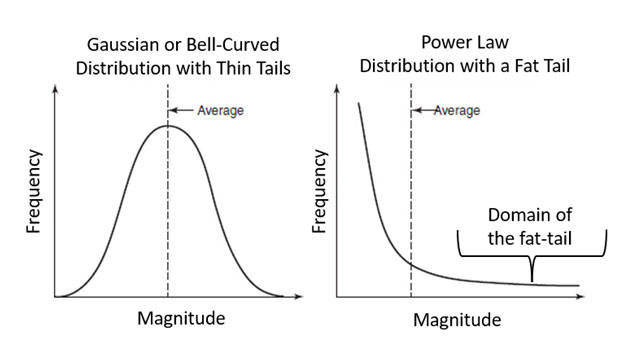 Figure 1 visually illustrates the difference between power laws and Gaussian distributions. Power laws have a single tail whereas Gaussian distributions have two tails. The tail of a power law is fatter than that of the Gaussian distribution at large values, which as previously mentioned means extreme events are more common. The fat-tailed world is sometimes called the “Paretian World”. The Pareto principle was first stated by the Italian economist Vilfredo Pareto in 1896, who observed that 80% of the land in Italy was owned by only 20% of the population. He also witnessed this happening with plants in his garden—20% of his plants were bearing 80% of the fruit. This is one outcome of power laws and has been generalized to the Pareto Rule, which states that 80% of outcomes result from 20% of actions, or 80% of impacts result from 20% of events (of course that is not always exactly true even for fat-tailed distributions – it can be greater or smaller).